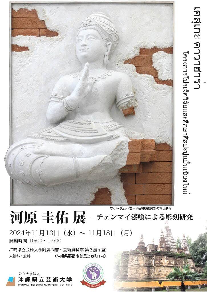 沖縄県立芸術大学とタイ王国のチェンマイ大学美術学部彫刻学科の協力を得て開かれる本個展では、レリーフ作品を始め、チェンマイ漆喰を用いた様々な作品、金属素材と漆喰のコンビネーション作品などが展示されます。