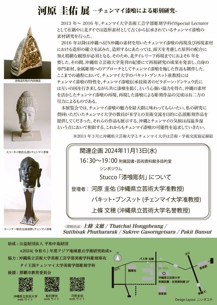 また関連企画のシンポジウムでは、タイはチェンマイ大学からパキット・ブンスット准教授、沖縄県芸術大学からは上條文穂名誉教授をお迎えして ”Stucco「漆喰彫刻」について” をテーマにチェンマイ漆喰の塑造としての素材の可能性について話し合いがなされる。
